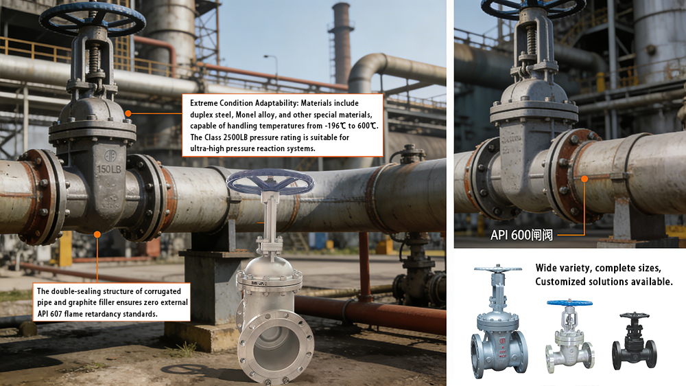 Основные компоненты химических заводов, такие как реакторные системы, трубопроводы для транспортировки среды и секции очистки отходящих газов, как правило, сталкиваются с тремя проблемами: высокими температурами (300-600℃), высоким давлением (класс 150-2500 фунтов) и сильной коррозией (кислоты/щелочи/сероводород), а рабочая среда часто является легковоспламеняющейся, взрывоопасной или токсичной. Клапаны API, соответствующие строгим стандартам, таким как API 600 (задвижки) и API 623 (шаровые клапаны), стали основным выбором.